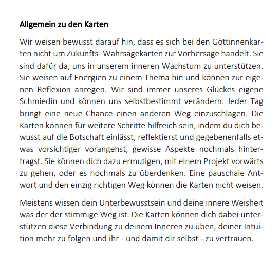 Jede Göttin hat ein oder mehrere Themen, die sie verkörpert. Sie unterstützen uns auf unterschiedliche Weise, sie beschützen, geben Impulse und regen zur Reflexion an. Denn jede Göttin spiegelt archetypische Anteile, die in uns allen vorhanden sind. Dies bedeutet, dass der menschliche Urtyp psychologische Verhaltensmuster aufweist, die jede Frau in sich finden kann. Dieses Kartenset ermutigt, sich mit ihnen zu befassen und alte, tief verinnerlichte Muster und Glaubenssätze zu erkennen, zu hinterfragen und allenfalls zu auch zu verändern.