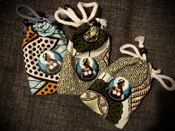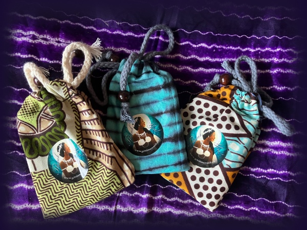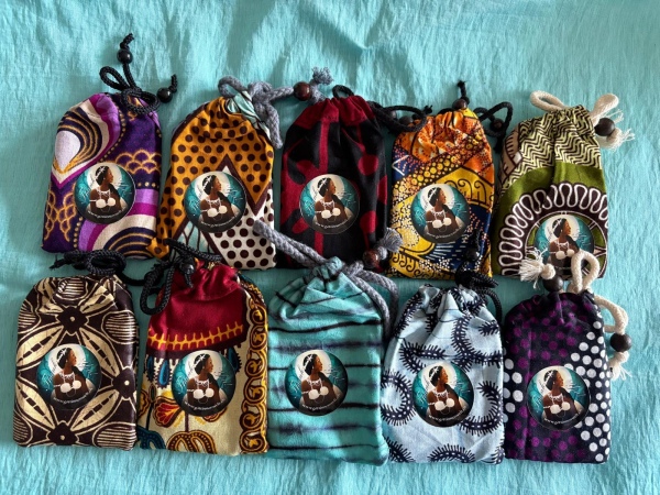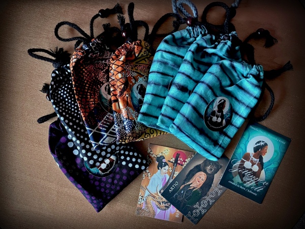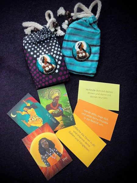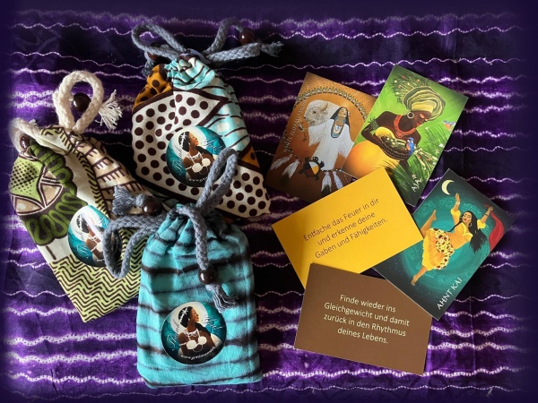 26 von den 57 Göttinnen aus dem Kartenset in Visitenkartengrösse! Im Stoffbeutel aus afrikanischem Stoff sind sie gut verstaut und können problemlos mitgenommen werden.